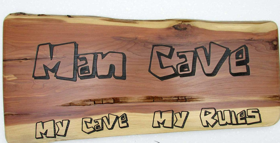 This is our Man Cave My Cave My Rules Cedar Sign. We take pride in our products. What's so special with this item? Timber 2 Glass has completely made this beautiful sign including the laser engraving. This Man Cave Cedar Sign has black color filled letters. This board features the natural beauty of the live edge and that is what makes our boards special. Our finished boards are preserved with polyurethane. This beautiful Man Cave My Cave My Rules Cedar Sign is ready to ship. Shipping may show to be shipped by USPS, but actually may be shipped by UPS because of the size. The price of shipping is usually about the same for both. We always try to find the lowest cost in shipping for our customers.